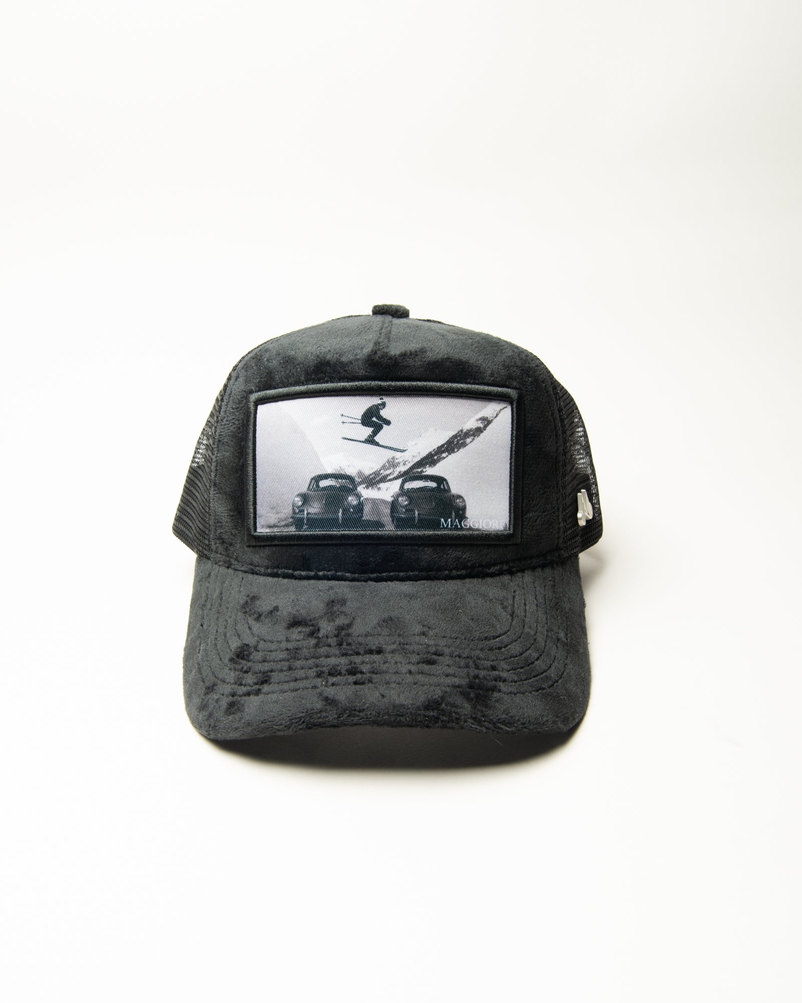 The MAGGIORE Ski Grey Cap captures the freedom and focus of life on the slopes. With its clean grey tones and a vivid image of a skier with a cowboy hat cutting through fresh snow, this cap brings together classic style and the spirit of winter adventure.